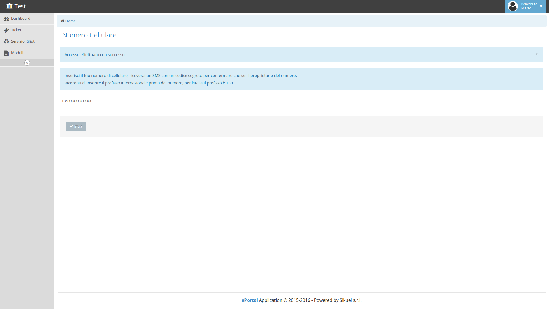 Al primo login verrà richiesto di inserire il proprio numero di cellulare preceduto dal prefisso nazionale '+39'.